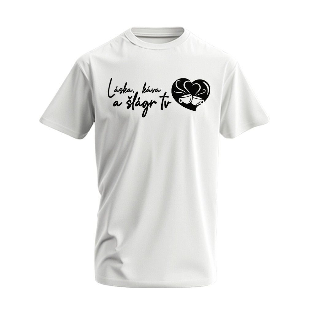 Bílé tričko s nápisem „Láska, káva a Šlágr TV“ a motivem šálku kávy. Skvělý kousek pro všechny, kteří si užívají život s hudbou a pohodou.