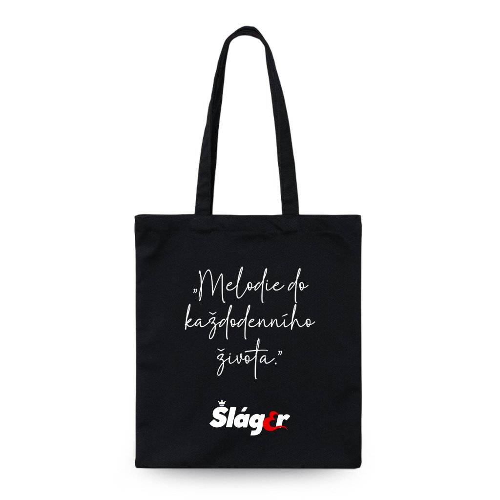 Stylová a praktická černá plátěná taška s nápisem „Melodie do každodenního života“ a logem Šlágru je ideálním společníkem na nákupy, výlety i běžné nošení.