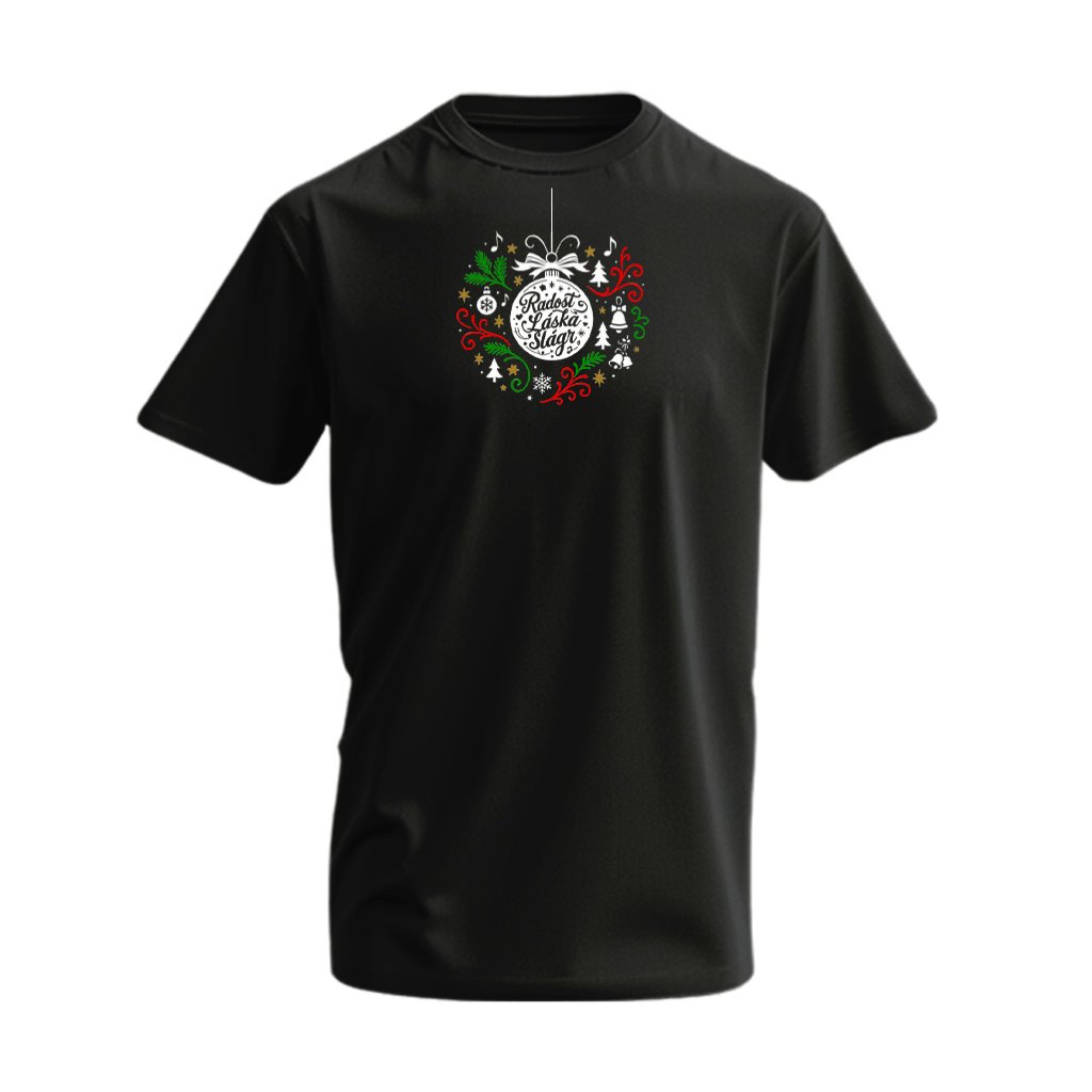 Stylové vánoční tričko s motivem ozdoby a nápisem „Radost, Láska, Šlágr“, doplněné o zlaté, červené a zelené prvky. Elegantní a sváteční kousek pro fanoušky Šlágru 🎄✨