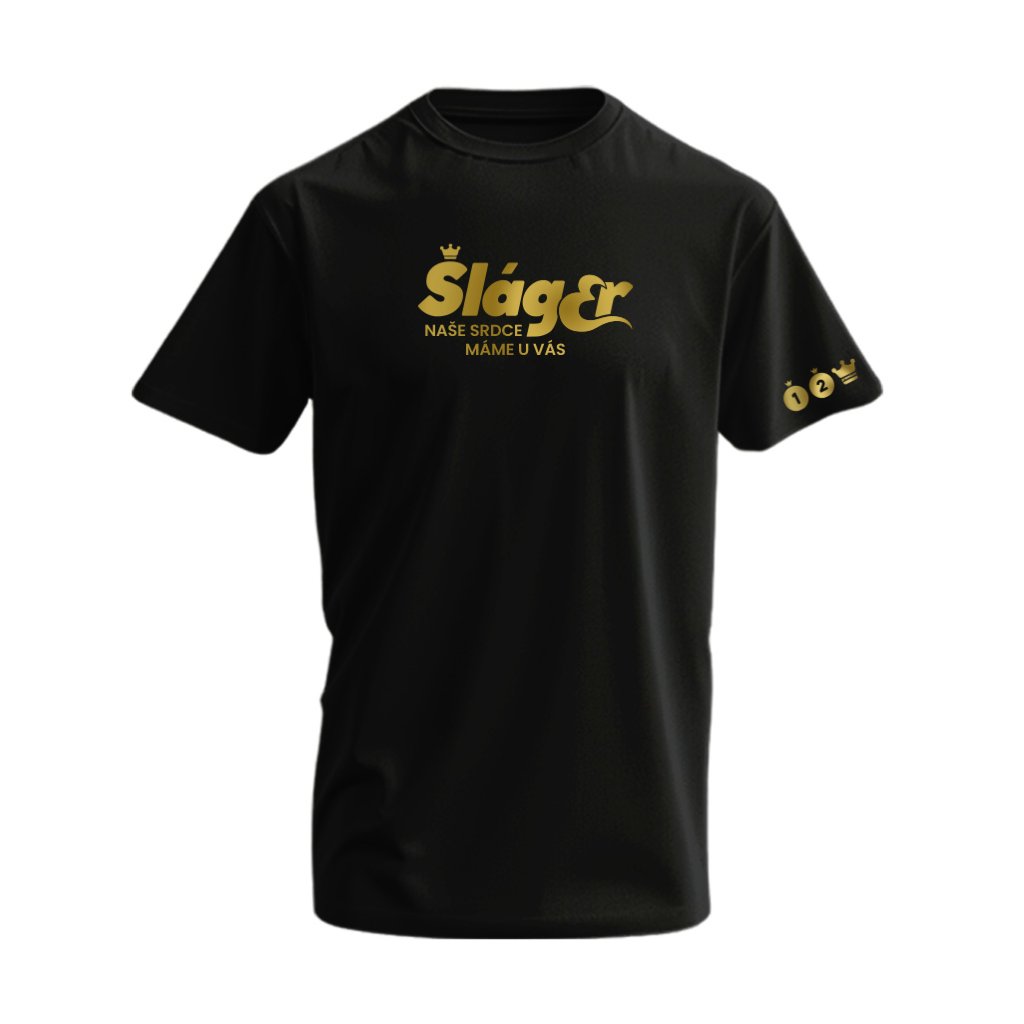 Elegantní černé tričko se zlatým logem Šlágr TV a sloganem „Naše srdce máme u vás“. Na rukávu zdobí tričko loga všech tří našich TV stanic.
