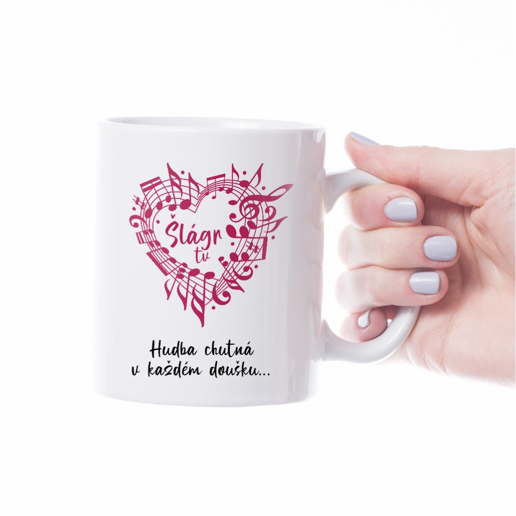 Keramický hrnek se srdcem z not, nápisem Šlágr TV a sloganem „Hudba chutná v každém doušku“. Ideální pro chvíle pohody s oblíbeným nápojem.