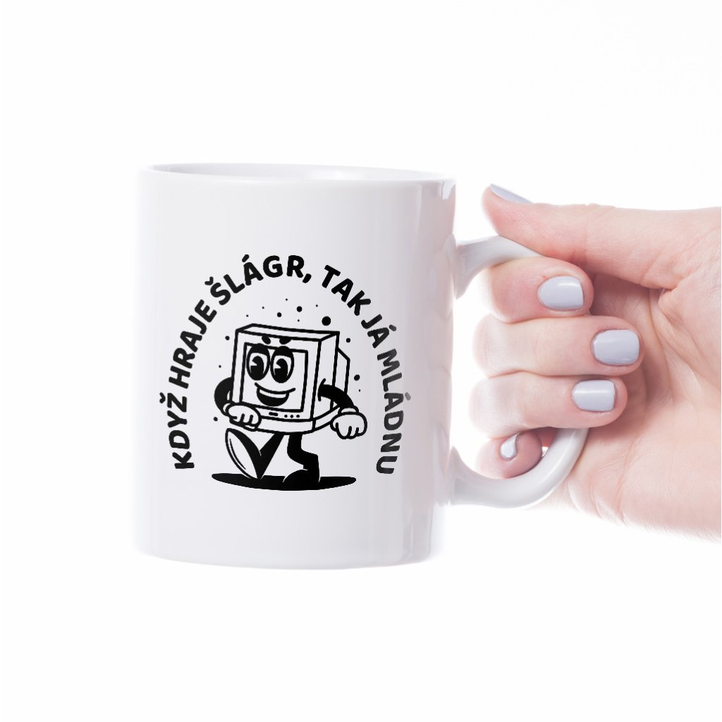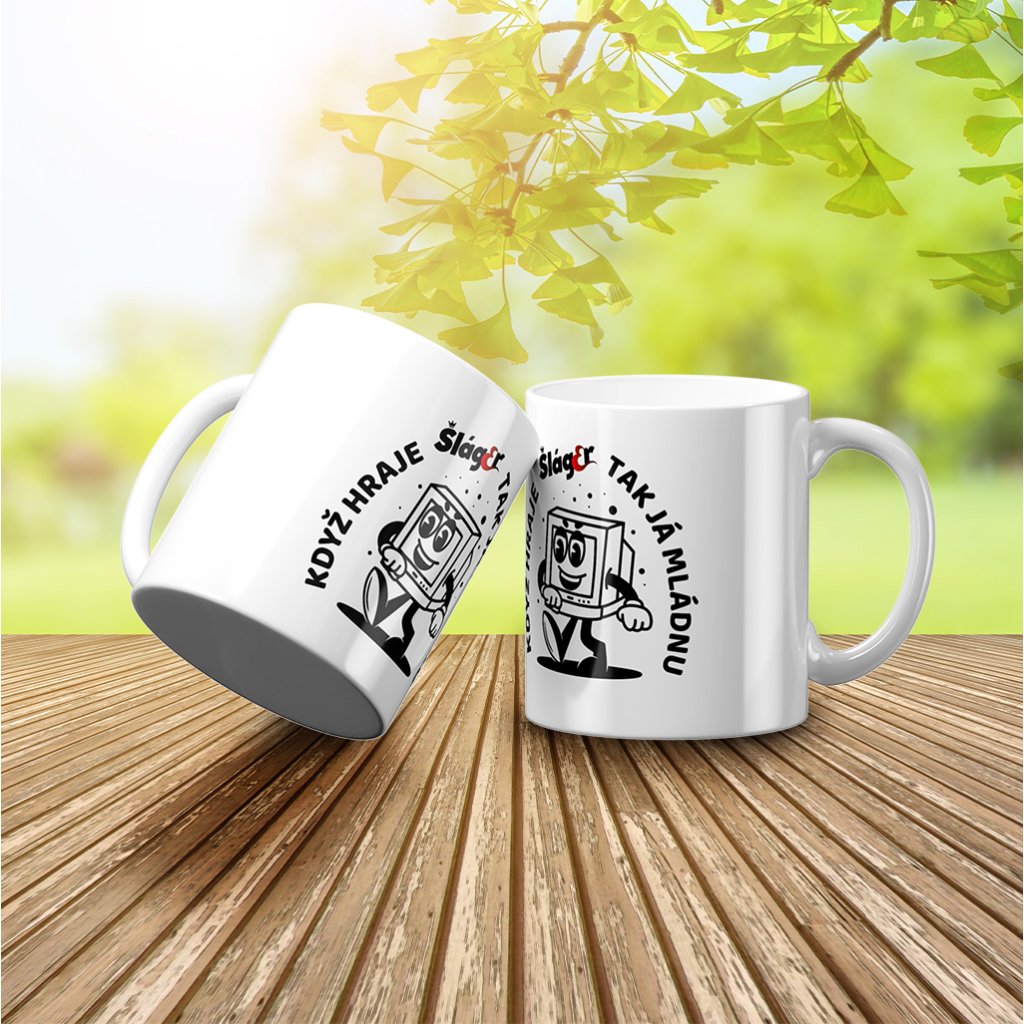 Keramický hrnek s nápisem „Když hraje Šlágr, tak já mládnu“ – veselý společník pro každého, kdo miluje hudbu a dobrou náladu.